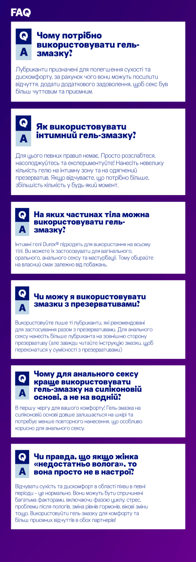 Интимный лубрикант на водной или силиконовой основе предназначен для устранения сухости и уменьшения трения во время полового акта, обеспечивая дополнительное увлажнение и комфорт. Средство обеспечивает гладкое скольжение и совместимо с использованием латексных презервативов.