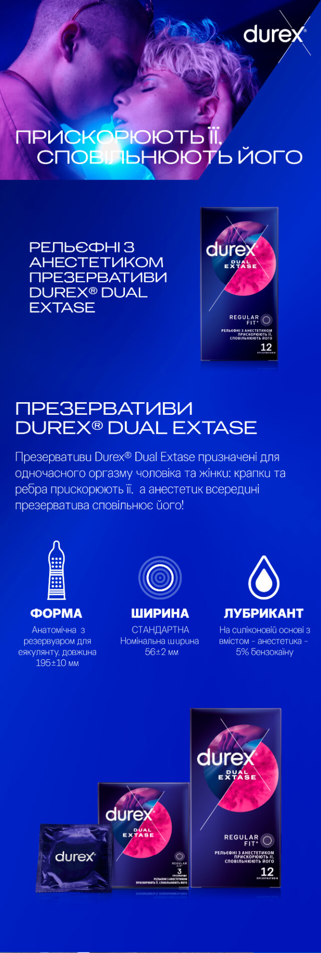 - Латексные презервативы с силиконовой смазкой DUREX® Dual Extase (рельефные с анестетиком), 3 шт. и 12 шт.