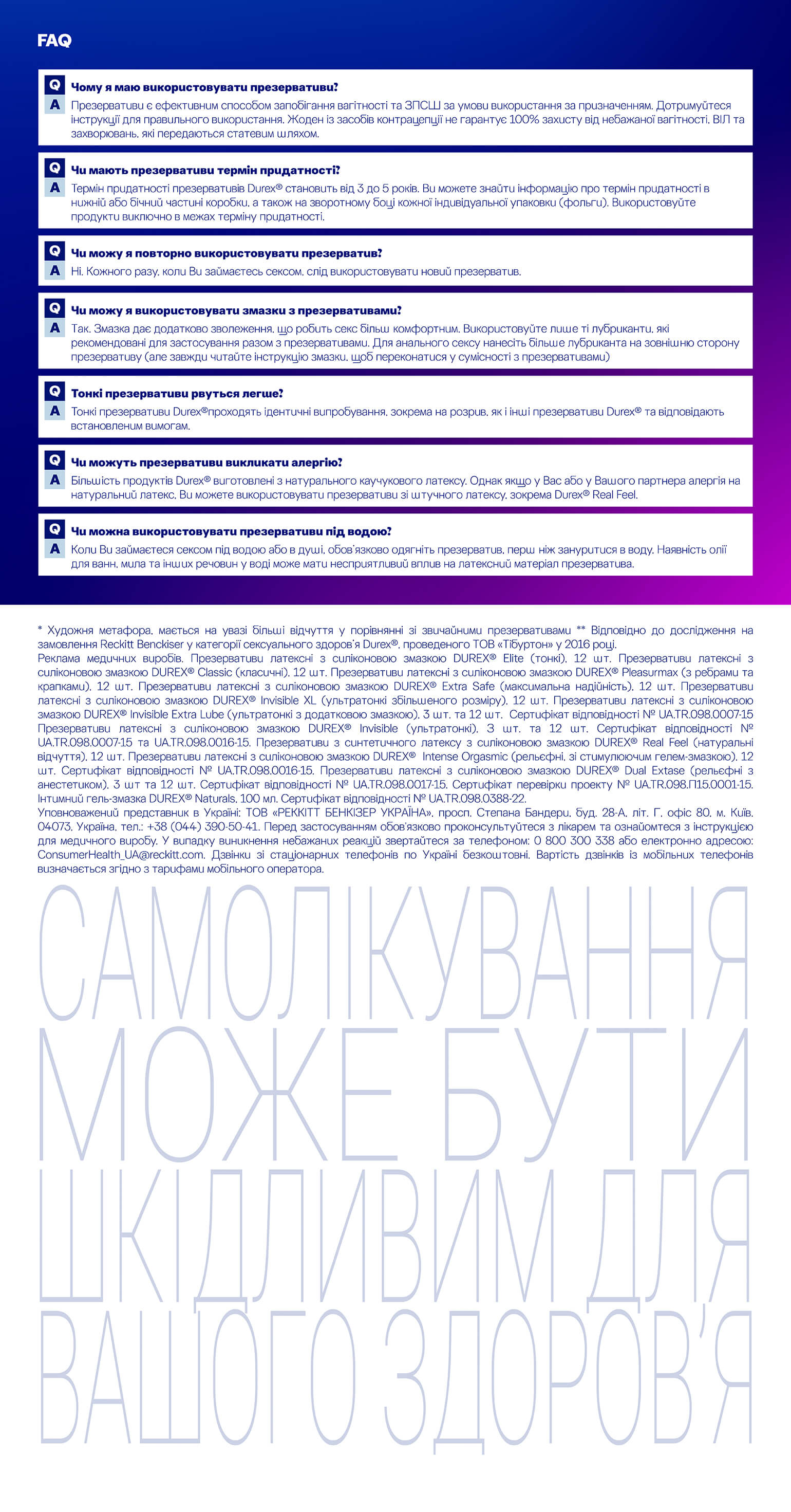 Презервативы Durex имеют статус медицинского изделия, предназначенного для планирования семьи и профилактики заболеваний, поэтому любая информация о них предоставляется в соответствии с требованиями к рекламе медицинских изделий. В рекламных материалах не содержатся утверждения о гарантии эффективности или безопасности, выходящие за рамки официально подтверждённых данных.