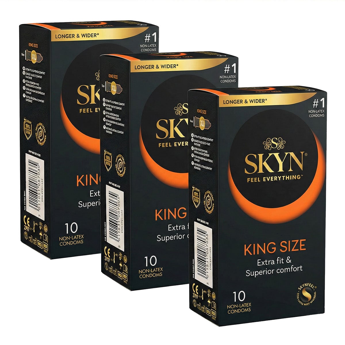 Все презервативы изготовлены из революционного материала SKYNFEEL. Этот безлатексный полиизопрен мягче и эластичнее обычного латекса, что в сочетании с увеличенным размером создает ощущение абсолютной естественности. Материал отлично проводит тепло и не имеет специфического запаха, обеспечивая эффект «второй кожи» даже в формате King size.
