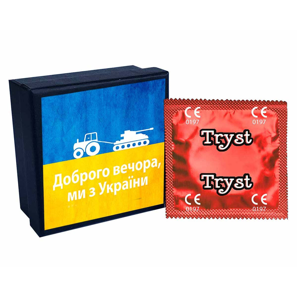 Ты только глянь на эту коробочку! Снаружи — стильная упаковка в патриотичных цветах с трактором, который тянет танк (и это не шутка), а внутри — пять качественных ультратонких презервативов TRYST. Прозрачные, без запаха, гладкие, с анатомической формой. Всё как надо, только подано с характером.