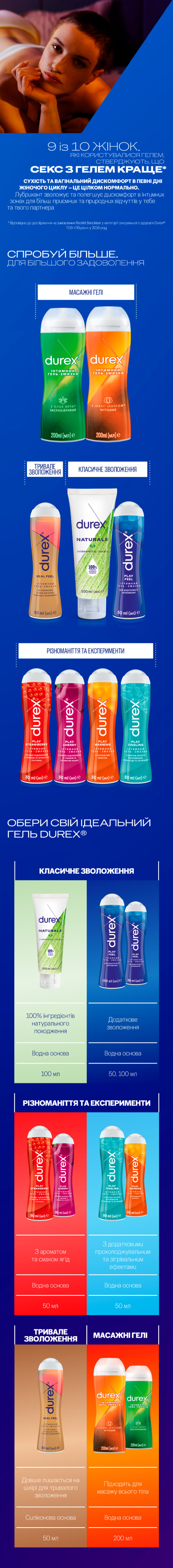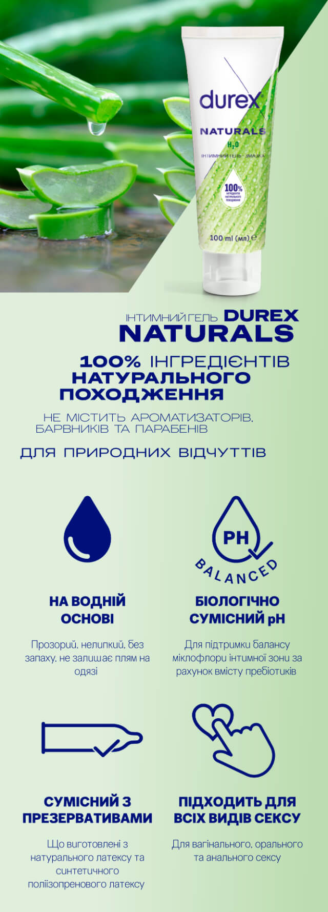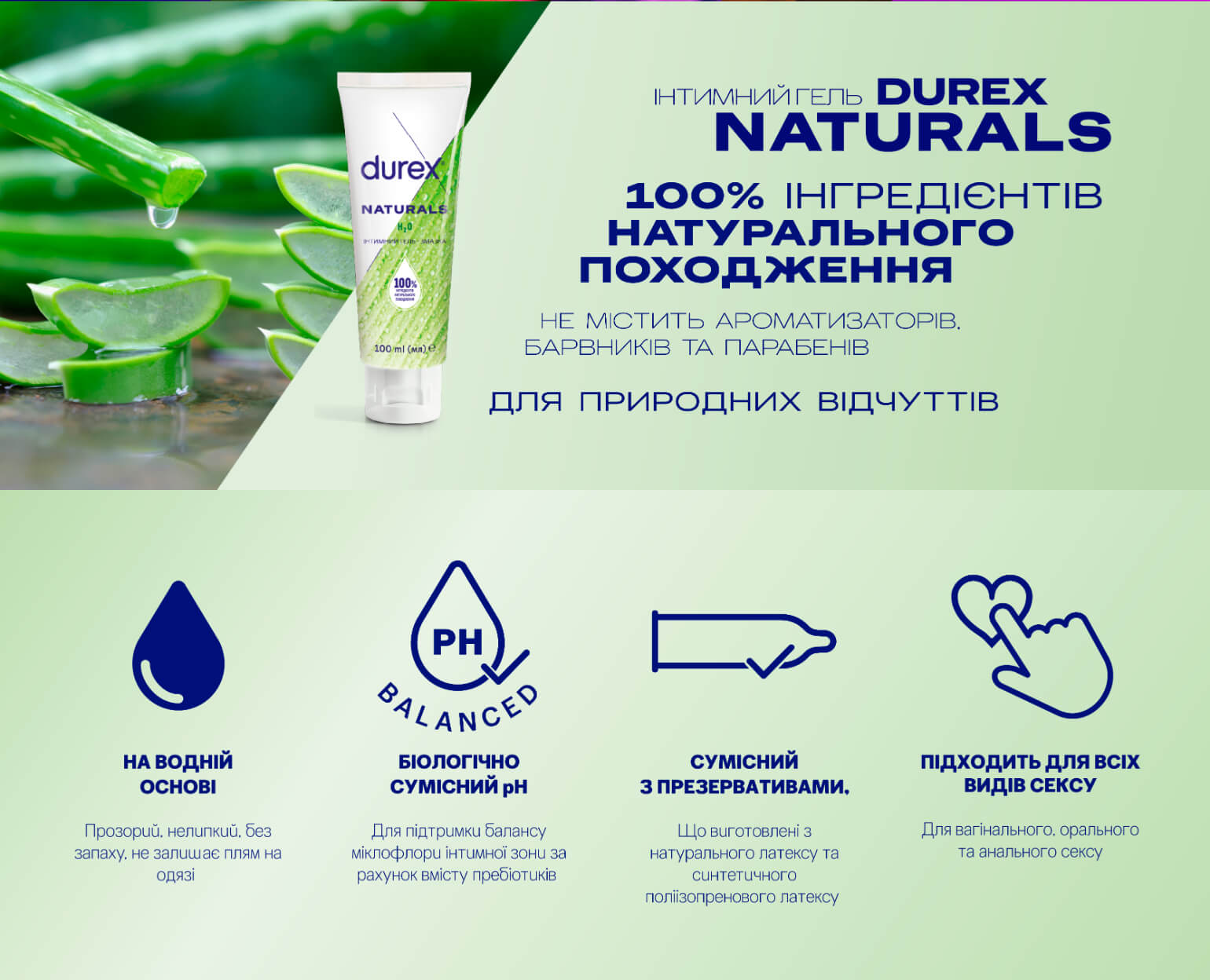 Інтимний гель-змазка Durex® Naturals –це 100% натуральний продукт, призначений для того, щоб зробити інтимні моменти приємними, природніми та хвилюючими. Склад на водній основі не містить ароматизаторів та барвників. Гель-змазка має біологічно сумісний рН за рахунок вмісту пребіотиків. Продукт сприяє зволоженню інтимних зон, забезпечуючи приємні відчуття та комфорт. Склад продукту дозволяє використовувати його разом з латексними виробами і сексуальними іграшками. Містить 100% натуральні інгредієнти.