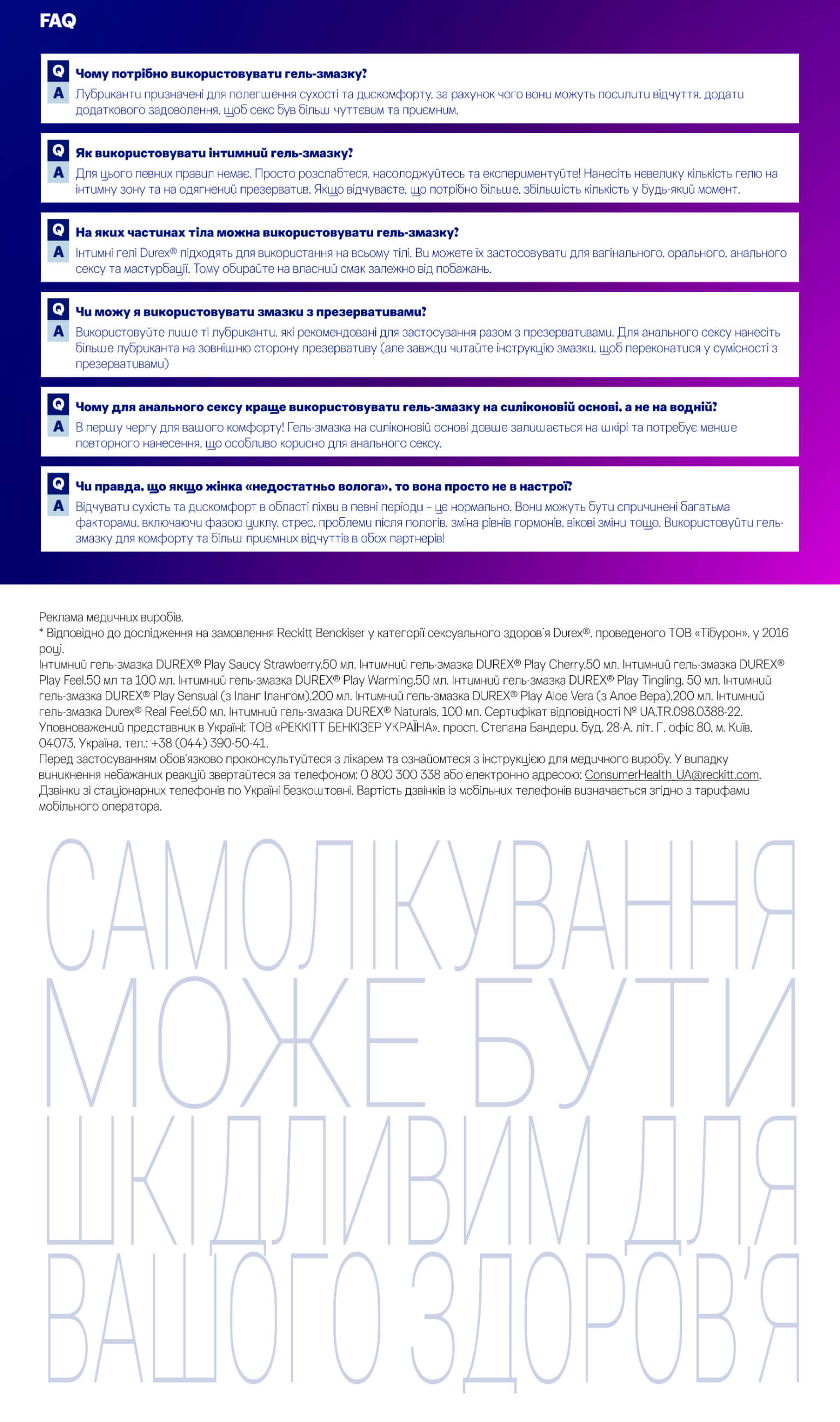 - Не використовуйте лубрикант на пошкодженій чи запаленій шкірі або при алергії на компоненти.
