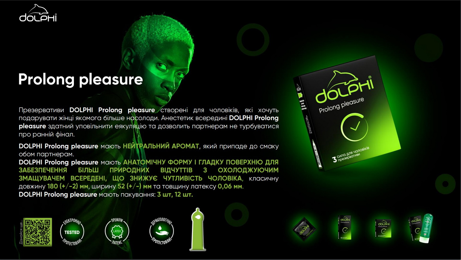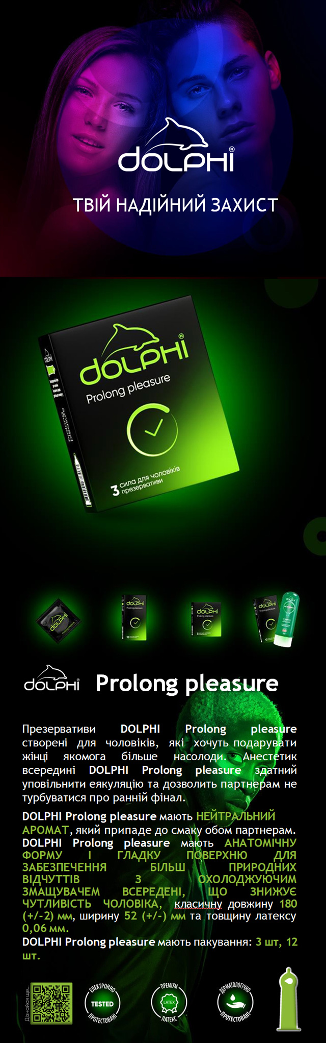 Презервативи Dolphi Prolong Pleasure розроблені спеціально для чоловіків, яким важливо не лише відчути задоволення, а й тримати його під контролем. Завдяки змазці з бензокаїном 8%, вони відтерміновують еякуляцію, не знижуючи рівень чуттєвості.