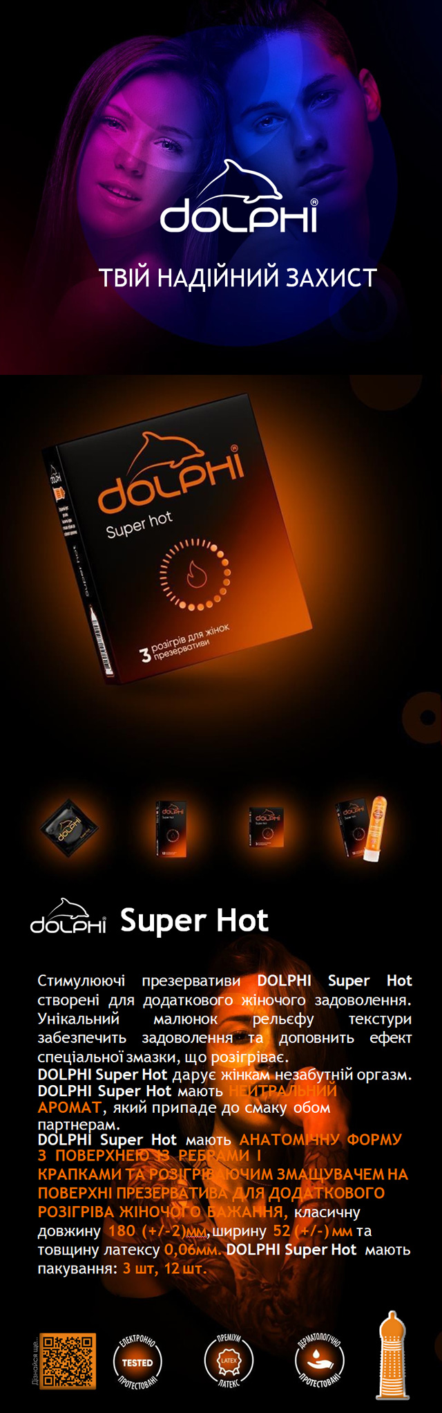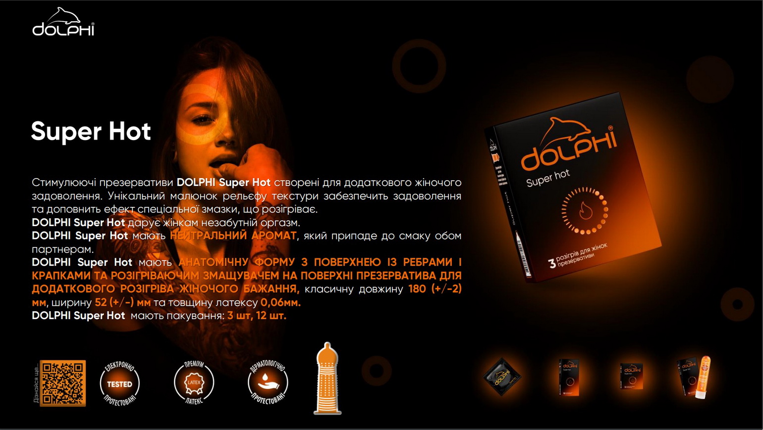 Іноді варто просто відпустити контроль і дозволити тілу жадати. Ці презервативи саме для таких моментів. Dolphi Super Hot збуджують ще до доторків — завдяки спеціальній зігріваючій змазці, яка ніжно розпалює і підсилює кожен рух.